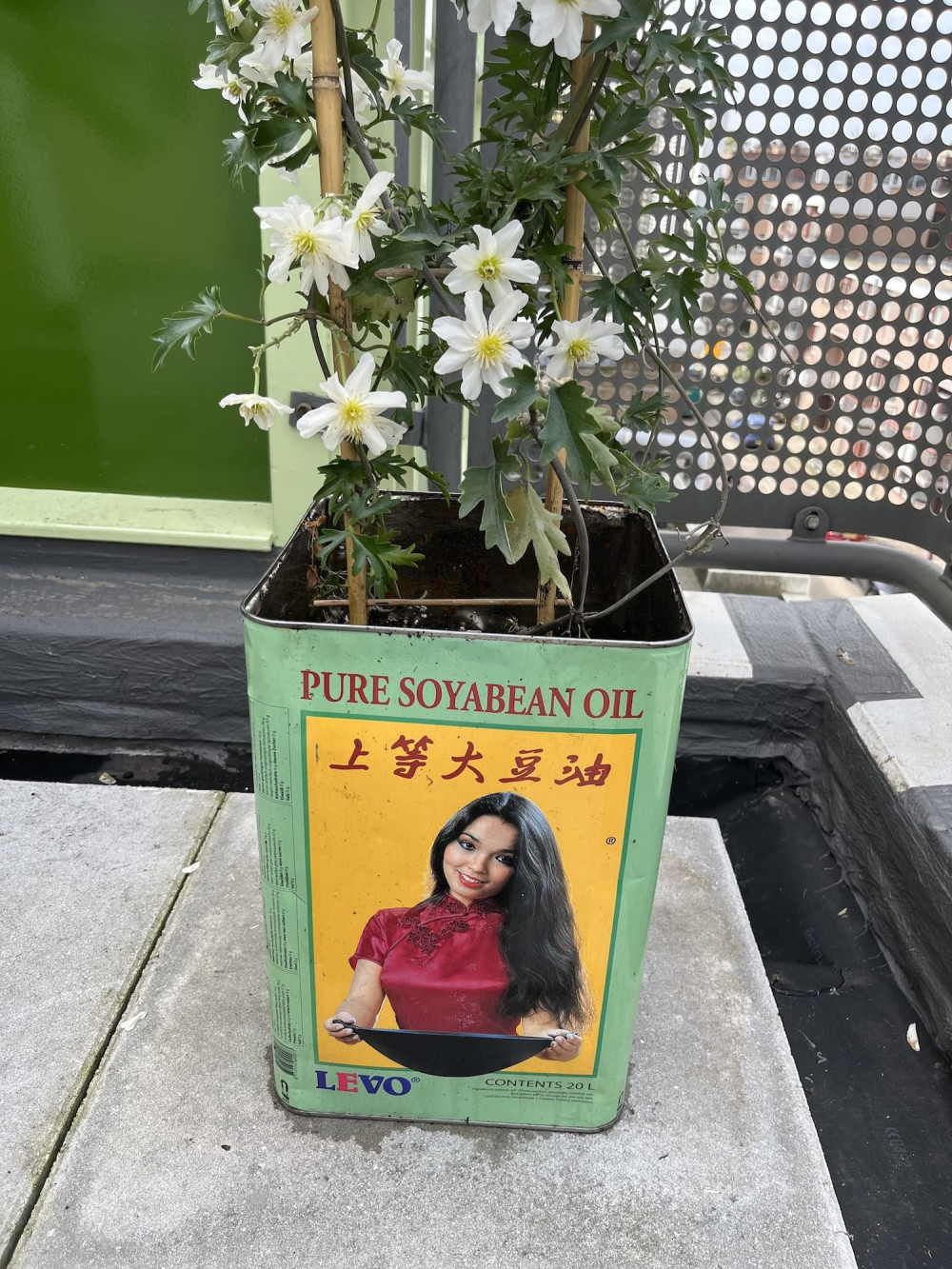 Dit vat is van het merk LEVO en bevatte sojaolie. Met een zaag, een boormachine en wat geduld heb ik het omgebouwd tot een plantenbak die nu met witte bloemen voor de deur staat. Het kost hooguit een middagje werk, vraagt geen speciale vaardigheden, en het resultaat is een stuk origineler dan wat je in de tuincentrum vindt.
