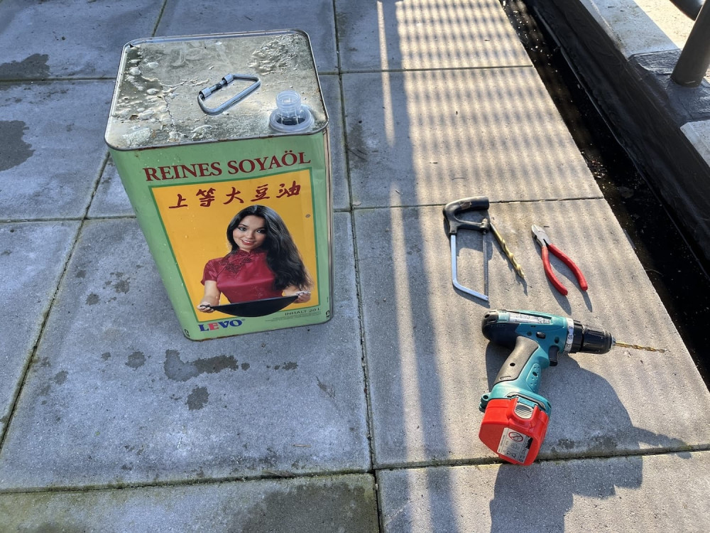 - Een leeg metalen kookolievat (hier: LEVO Sojaolie, 20 liter) — goed schoongespoeld