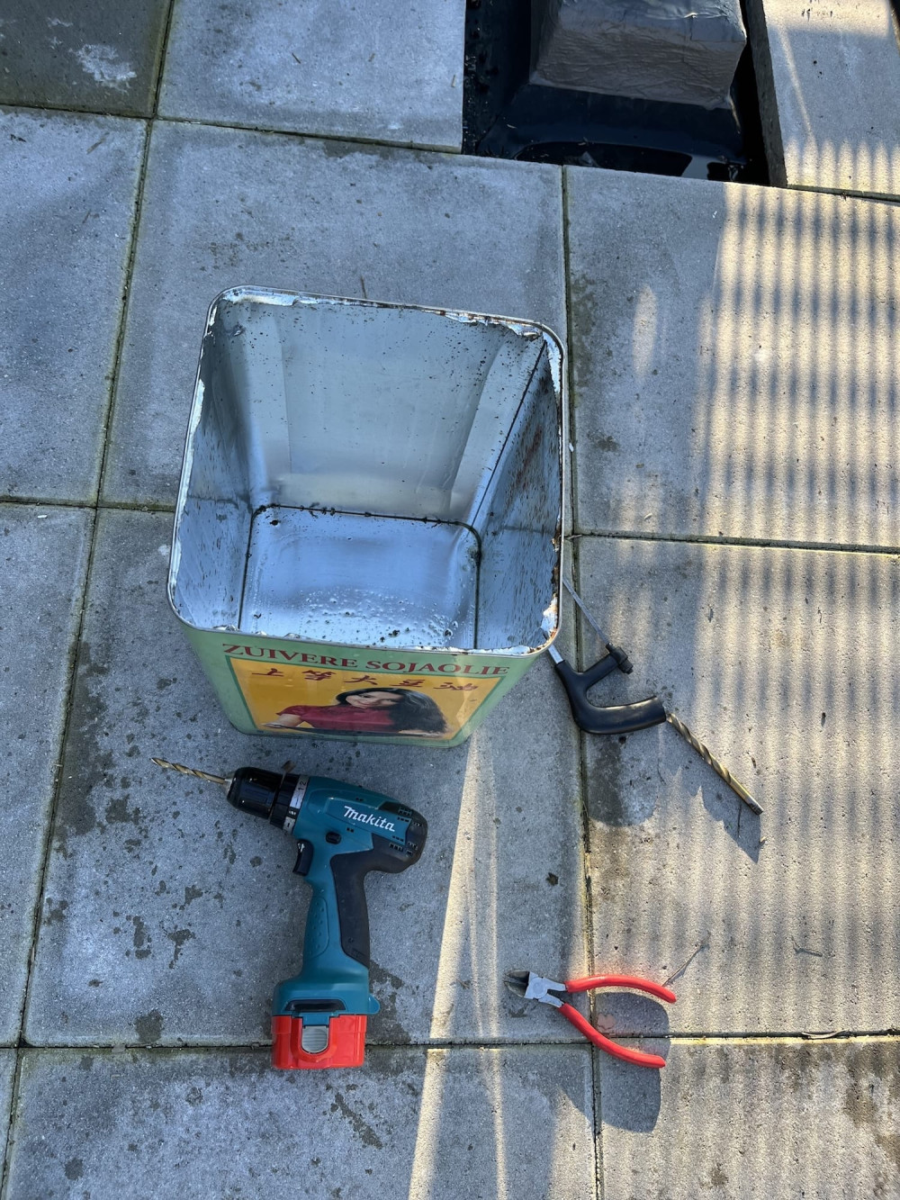 - Accu-boormachine (hier: Makita) met een metaalboor (HSS, goudkleurig) — voor afwateringsgaten