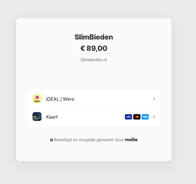 Voordat je het vragenformulier in mag, betaal je eerst €89. De betaling verloopt via Mollie, waarbij je kunt kiezen uit iDEAL/Wero of een creditcard (Visa, Mastercard, American Express). De betaling werd direct verwerkt.