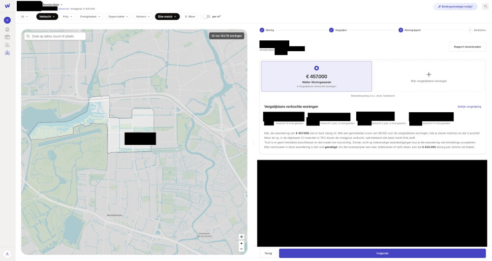 Een van de sterkste features van Walter is het woningrapport. Voor een woning in Amsterdam met een vraagprijs van €435.000 genereerde Walter binnen enkele seconden een uitgebreid rapport. De Walter Woningwaarde kwam uit op €457.000, gebaseerd op vier vergelijkbare verkochte woningen in de buurt.