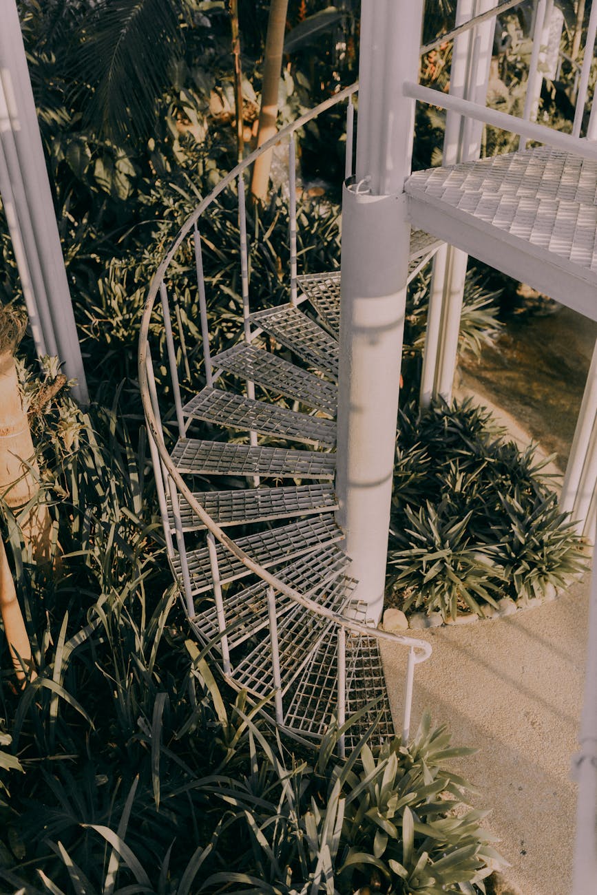 Stap in een oase van groen en industrieel design. Deze elegante wenteltrap omarmt de magie van natuur en architectuur, terwijl het zonlicht een magisch schouwspel van licht en schaduw creëert. ☀️