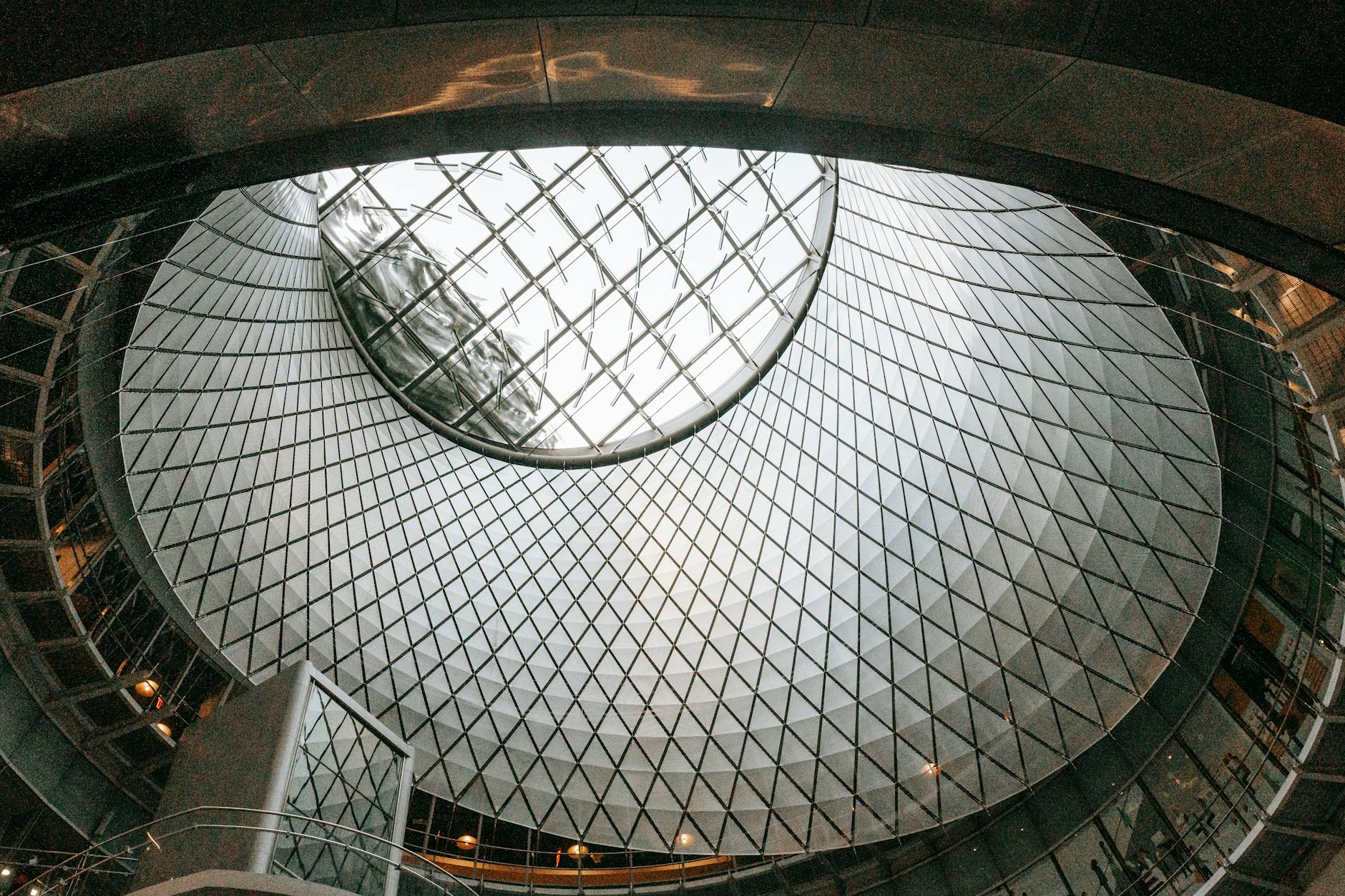 Onder de koepel van moderniteit en licht. ✨ Dit plafond is een meesterwerk van geometrisch design, waar glas en vorm samensmelten om een spel van licht in de ruimte te creëren. Perfecte harmonie tussen functie en schoonheid.